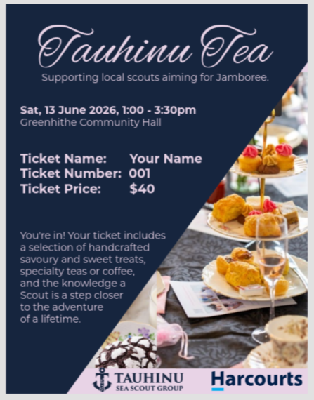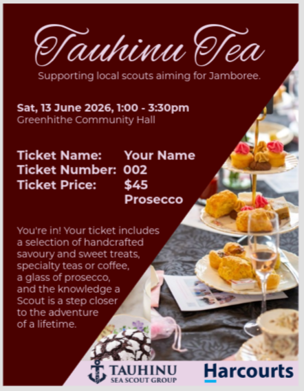 A single ticket to attend Tauhinu Tea supporting local scouts aiming for Jamboree.